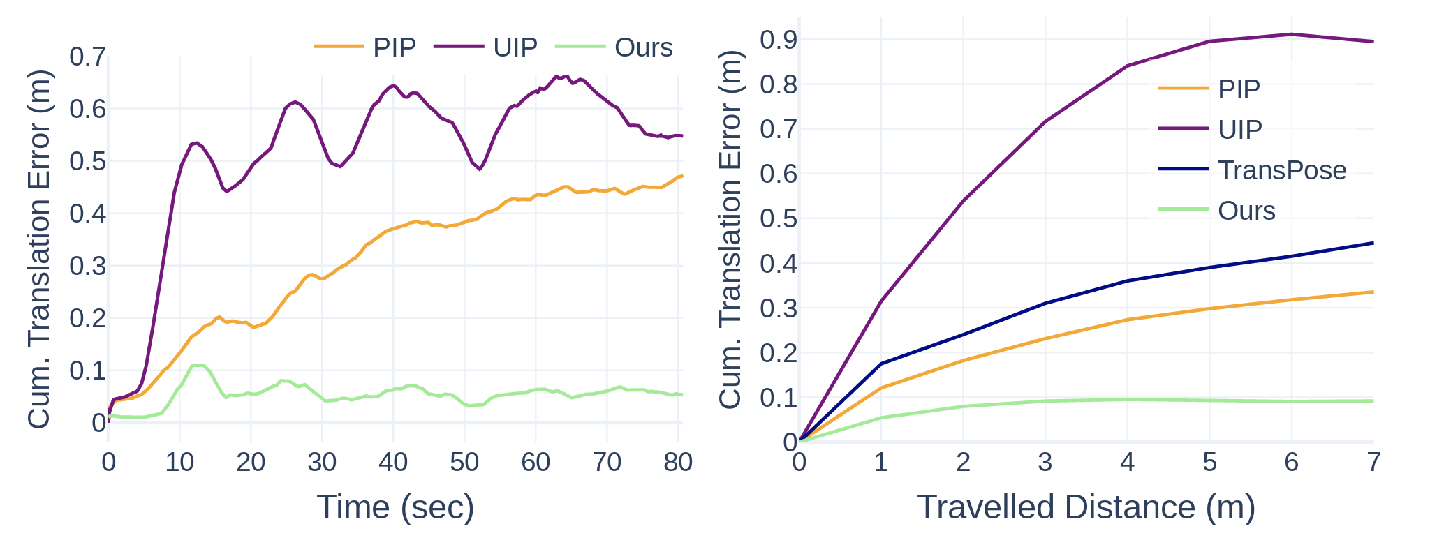 Unlike inertial-based methods, our approach is robust to cumulative error, both in time (left) and distance (right). By utilizing distance measurements and incorporating additional reference sensors as anchors, we can estimate the global position of the subject at every timestamp with minimal reliance on previous predictions.